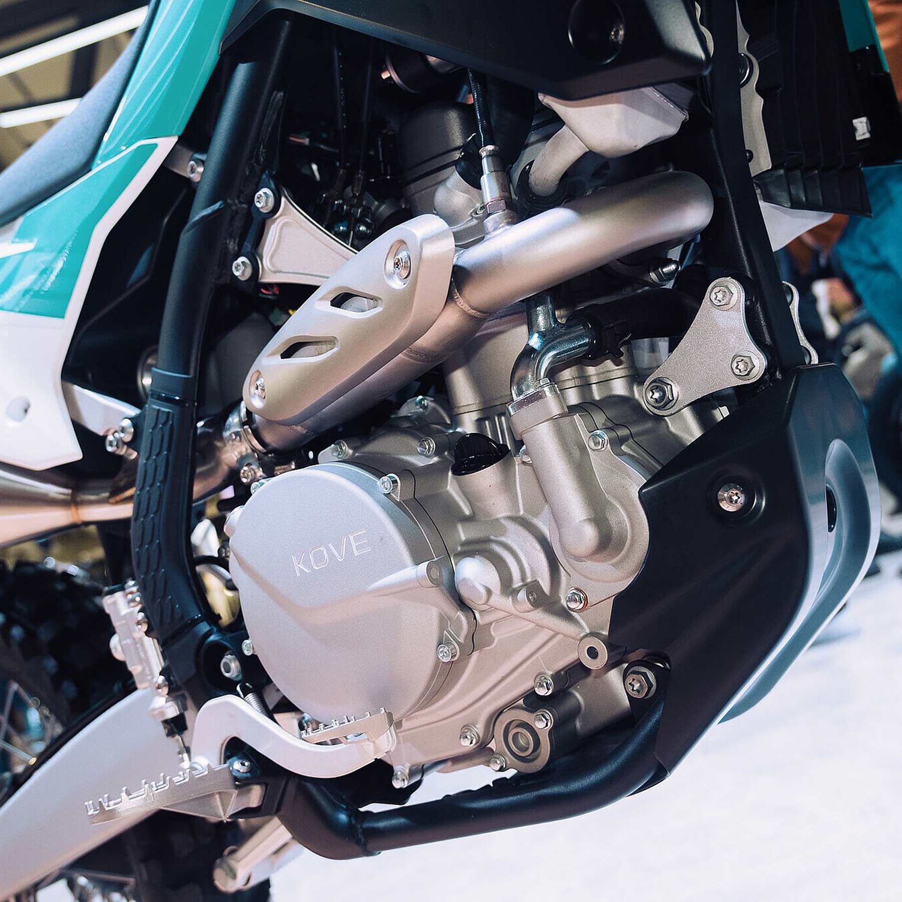 Der Motor der KOVE MX450 Enduro sei ein komplett neu entwickelter 450-ccm-Einzylinder, der laut Hersteller aus einem intensiven Testprogramm im Rahmen der Rallye Dakar hervorgegangen sei. Der wassergekühlte Viertakter leiste 35 kW (47,6 PS) bei 9.500 U/min und biete ein Drehmoment von 40 Nm bei 7.500 U/min. Mit einer Verdichtung von 13:1 und der BOSCH-Einspritzung sei der Eintopf auf präzise Gasannahme und gleichmäßige Leistungsabgabe ausgelegt.