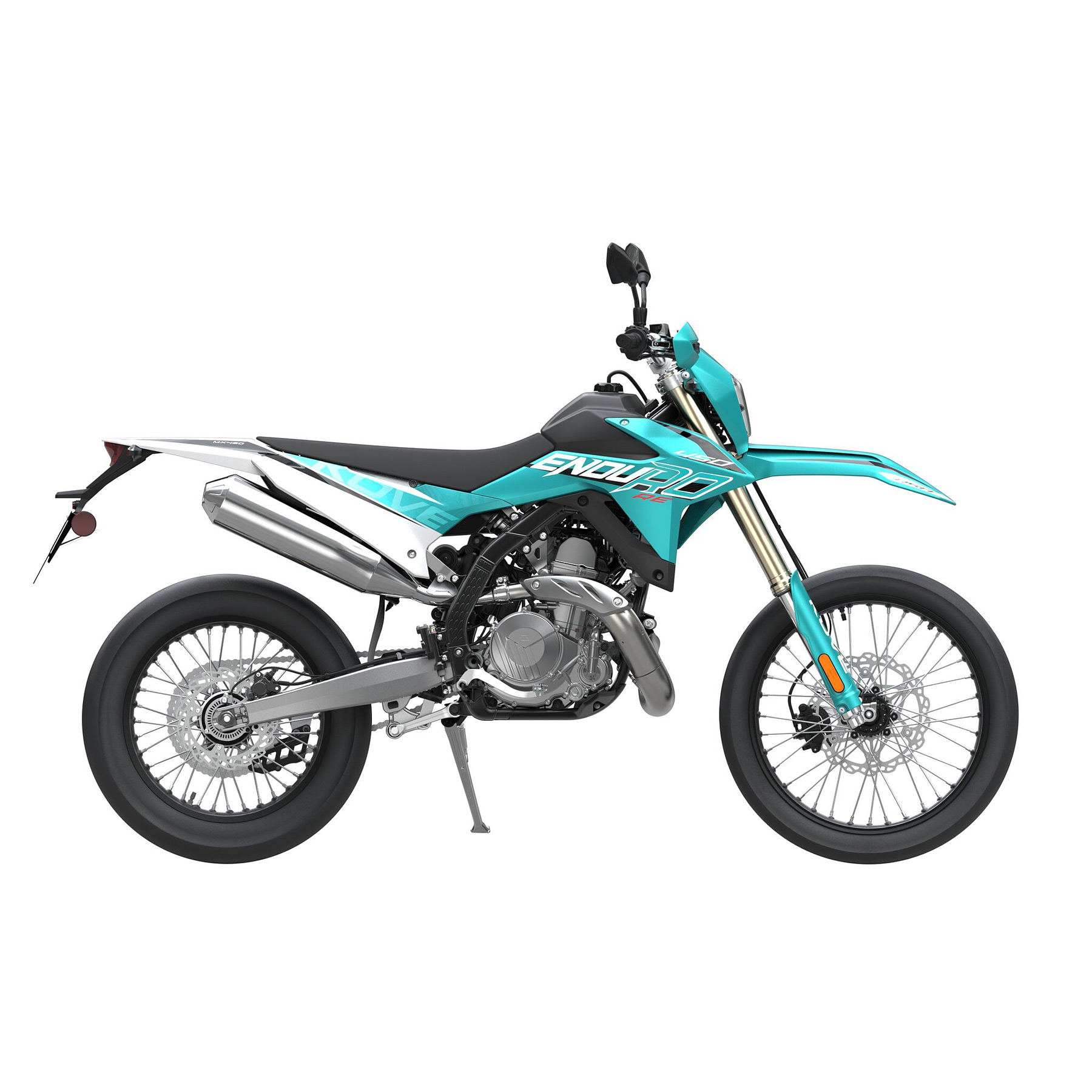 Gebremst wird mit Komponenten von Taisko: vorne eine Einzelscheibe mit Doppelkolben-Schwimmsattel, hinten eine Scheibe mit Einkolbensattel. Für zusätzliche Sicherheit ist ein Dual-ABS-System an Bord, das beide Räder überwacht. Auch bei der Beleuchtung zeigt sich die MX450 Enduro modern: Voll-LED-Scheinwerfer, Tagfahrlicht, LED-Blinker und ein LCD-Cockpit gehören zur Serienausstattung. Die Energieversorgung übernimmt eine leichte 2,3-Ah-Lithiumbatterie.