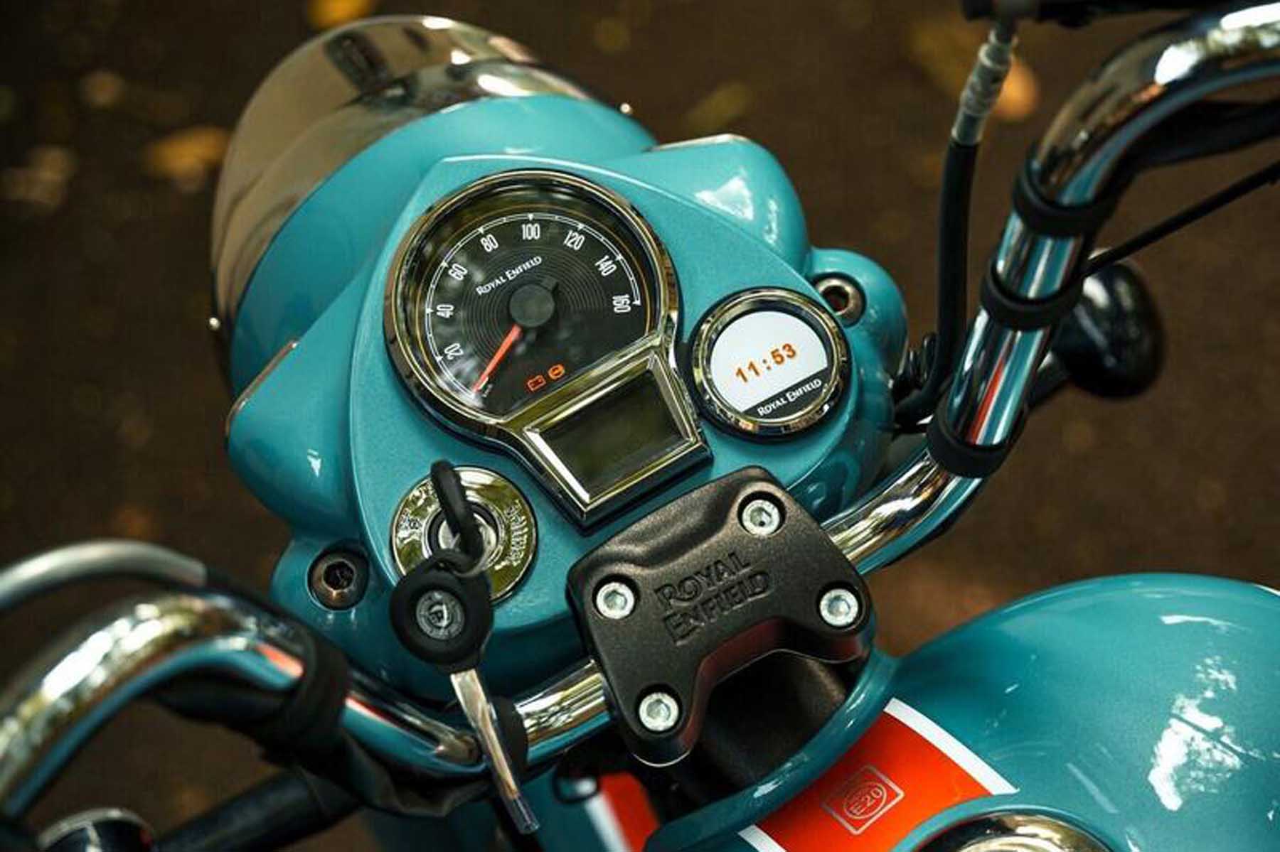 Inspiriert von traditionellen Mandalas mit kontrastierenden Orange- und Aquamarintönen, ergänzt durch schräg geschnittene Schalldämpfer und Chromdetails. Eine Reihe originaler Royal Enfield-Zubehörteile, inspiriert vom Bobber-Universum, unterstreichen den Charakter und Stil der Goan Classic 350. Dazu gehören ein individueller Fahrersitz, Griffe, Lenkerendenspiegel, eine Touren-Windschutzscheibe, ein Touren-Lenker, Deluxe-Fußrasten und Fußrastenabdeckungen aus Gummi, alle mit brauner Oberfläche für einen unverwechselbaren Look.