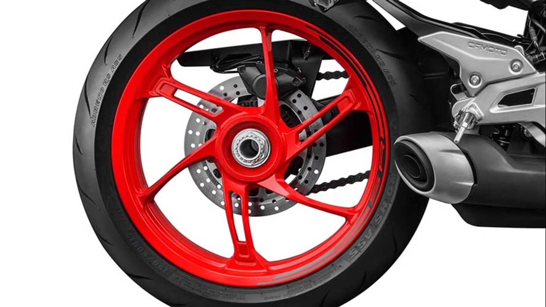 Bereits im Februar 2023 tauchten Informationen in China auf, die eine Variante der 450 SR mit einer Einarmschwinge zeigten und für Aufsehen sorgten. Gut ein Jahr später präsentierte CFMoto die 450 SR S offiziell für Europa, und selbst der Preis für den deutschen Markt ist bekannt. Technisch unterscheiden sich die 450 SR und die neue SR S nur durch den Umbau der hinteren Radaufhängung von zweiarmiger Profilschwinge auf Einarmschwinge, ebenfalls aus Aluminium und eine größere Bremse hinten (240 statt 220 mm). Und zur besseren Sicht auf das 6-Speichen-Rad weicht der seitliche Schalldämpfer einer Under-Engine-Anlage. Im bekannten Stahlrahmen erzeugt der Twin A2-konforme 48 PS bei 10.000/min und 39 Nm bei 7.750 Touren, wobei mancherorts noch die chinesischen 50 PS stehen. Das Trockengewicht liegt bei 169 Kilo, was fahrfertig 179 Kilo ergibt, wie bereits von der 450 SR bekannt.