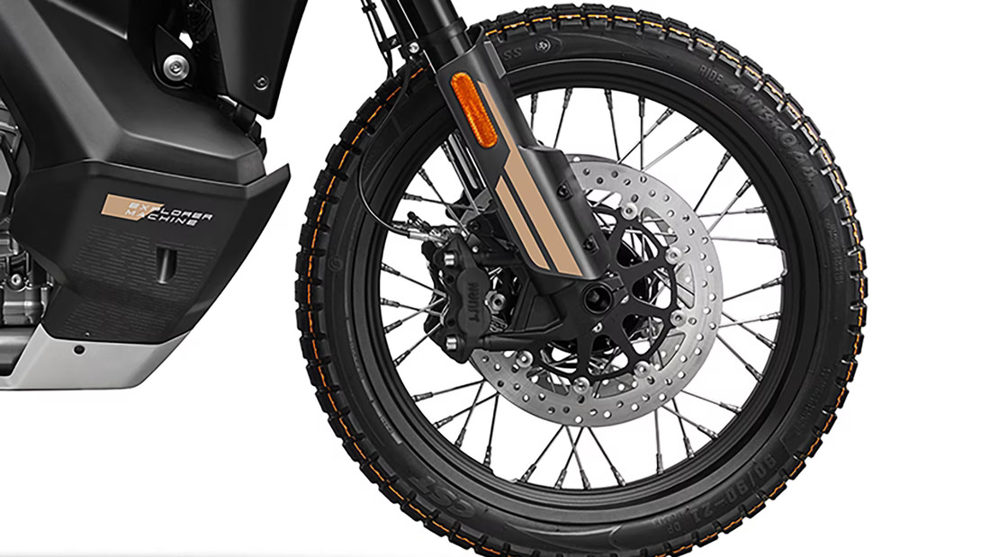 Zur "richtigen", also wirklich offroad-tauglichen, geländegängigen Enduro wird die CFMoto 800 MT-X nicht nur mit einer schnabelartig hohen Vorderradabdeckung, sondern vor allem mit der Art ihrer Räder. Denn dabei handelt es sich um schlauchlos abgedichtete Drahtspeichenräder in Enduro-Formaten, vorn mit 21 Zoll, hinten mit 18 Zoll Durchmesser – selbstverständlich mit grobstolliger Bereifung ab Werk. Enduro-typische Reifengrößen: 90/90-21 und 150/70-18. Die bisherige, gemäßigte CFMoto 800 MT mit der Zusatzbezeichnung Touring rollt auf Reiseenduro-Standard-Rädern, vorn 19 Zoll, hinten 17 Zoll.