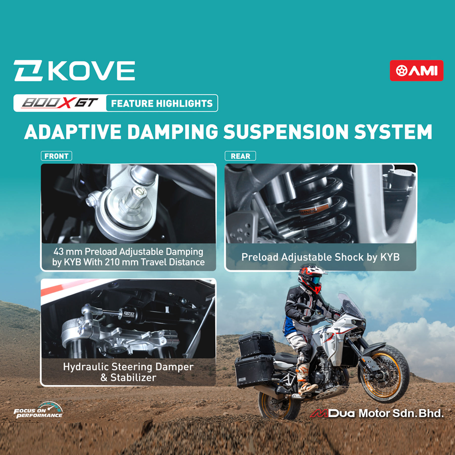 Das Design spiegelt den Abenteuergeist von KOVE wider – mit robusten Linien und einem markanteren Erscheinungsbild als die Standardversion. Der neue 22-Liter-Kraftstofftank erhöht die Reichweite auf über 400 Kilometer und bietet so mehr Freiraum für alle, die gerne ohne häufige Zwischenstopps unterwegs sind.