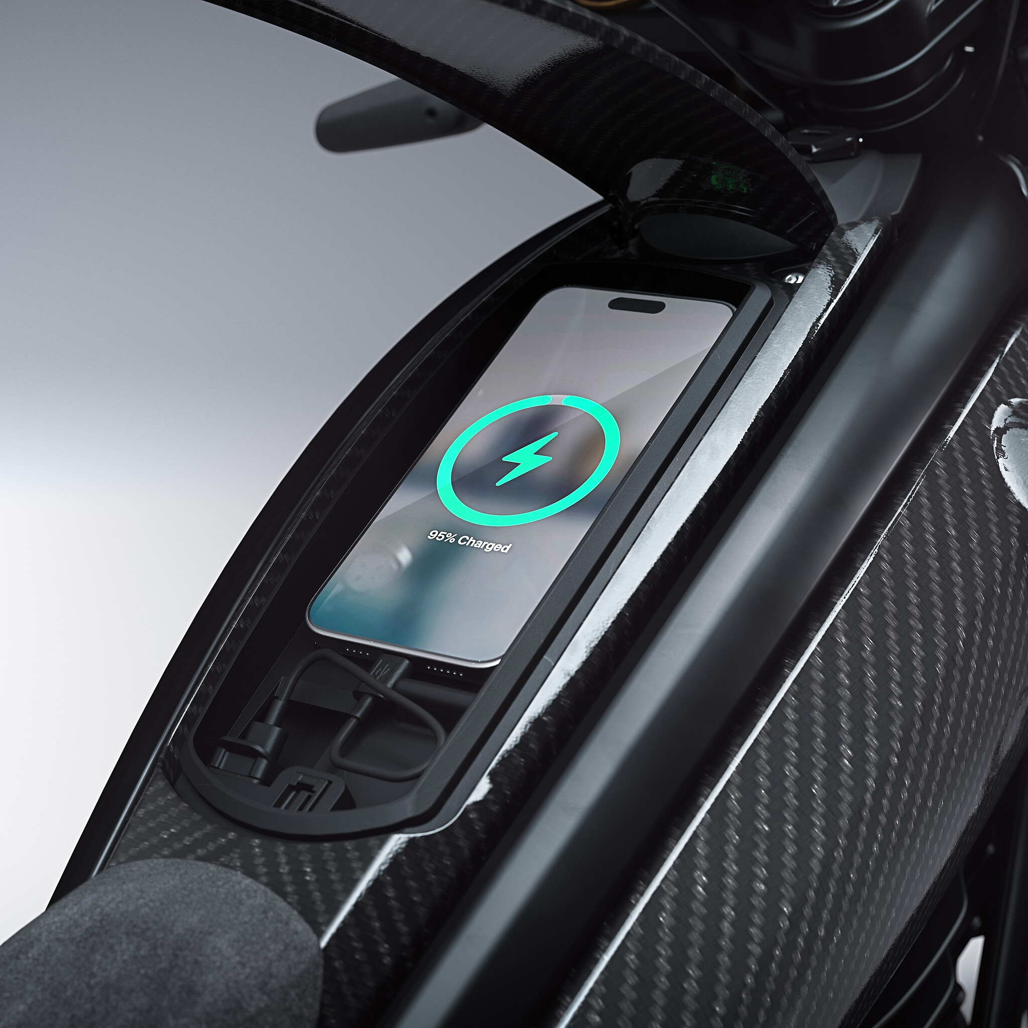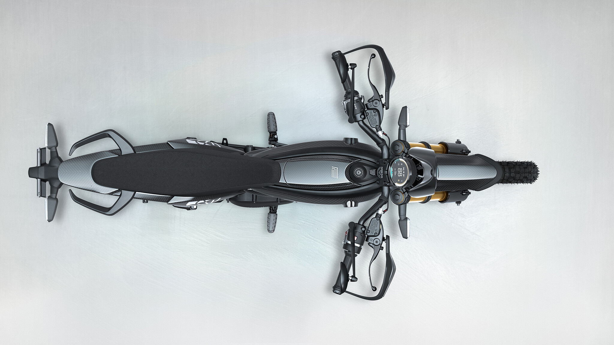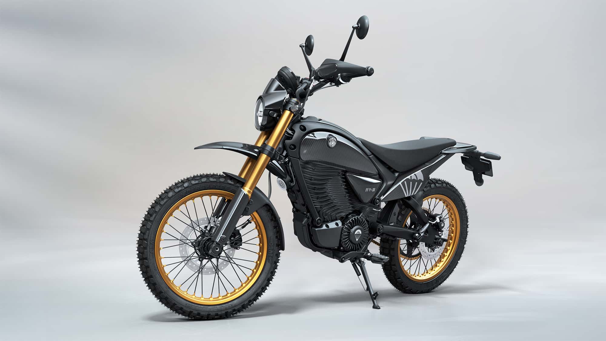 Das Design orientiert sich klar am Scrambler-Stil. Eine USD-Gabel, Kettenantrieb sowie eine Radkonfiguration mit 19 Zoll vorne und 18 Zoll hinten sollen Fahrstabilität und Offroad-Tauglichkeit unterstützen. Der lange Sitz im Enduro-Stil verspricht Komfort auf unebenem Terrain. Besonders auffällig: das gerippte Magnesium-Batteriegehäuse, das Gewicht spart und für eine verbesserte Kühlung sorgen soll. Das Gestaltungselement mit unterschiedlich angeordneten Finnen symbolisiert den Brückenschlag zwischen Vergangenheit und Gegenwart der Marke.
