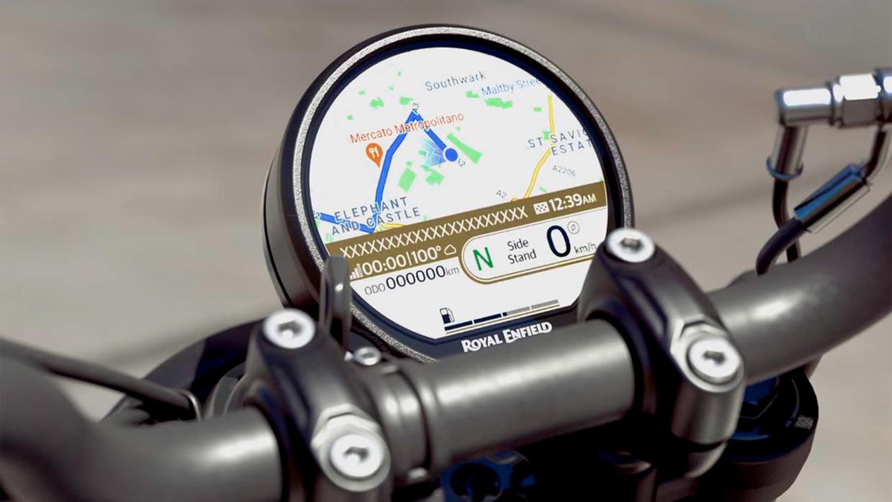 Schickes Feature an der neuen Royal Enfield Guerrilla 450 ist ein rundes TFT-Display mit Connectivity, WiFi und Google-Kartennavi. Weiterhin zeigt das Cockpit den Musikplayer des Smartphones an sowie eingehende Nachrichten. Allerdings: Das TFT-Display ist nur in den beiden Ausstattungsvarianten Dash und Flash zu haben.