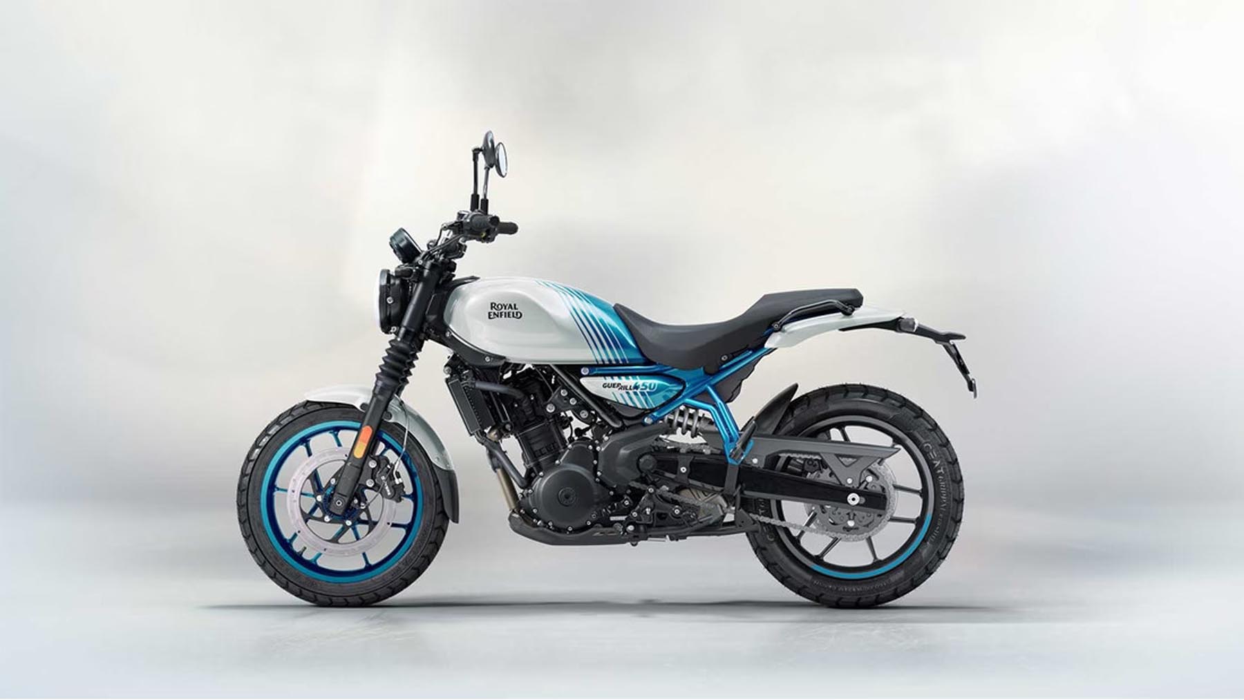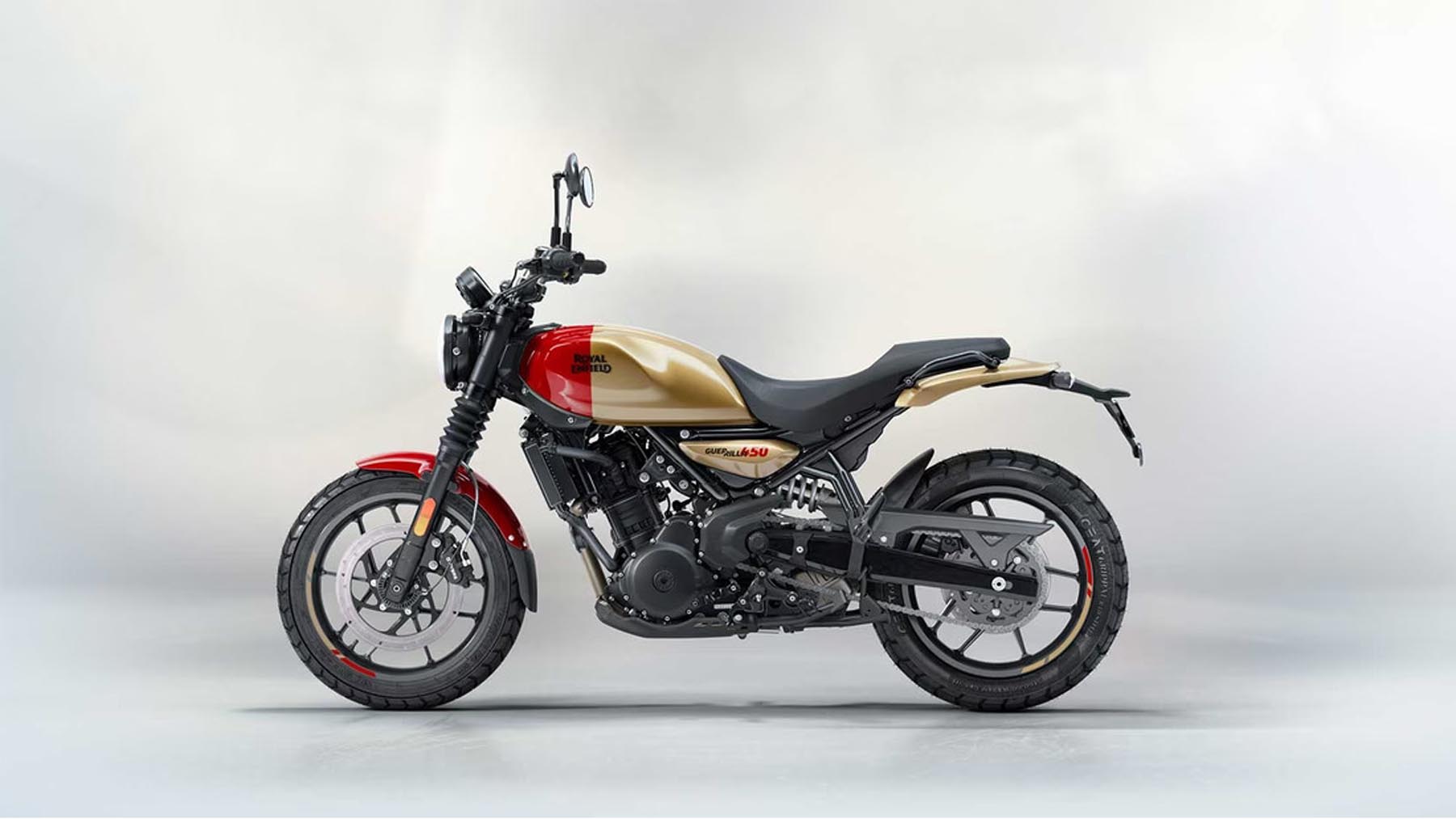 Der wassergekühlte Einzylinder-Motor der Royal Enfield Guerrilla 450 erzeugt überraschend niedrige 40 Nm bei 5.500 Touren und leistet 40 PS bei 8.000 Umdrehungen pro Minute. Allerdings: Für diese Leistungswerte braucht der Single angeblich nur 3,4 Liter pro 100 Kilometer, was bei einem Tankinhalt von maximal 11 Liter in theoretischen 323 Kilometer Reichweite resultiert. Welche Höchstgeschwindigkeit die 6 Gänge des Getriebes erlauben, ist bislang nicht bekannt. Übrigens: Das Motoröl ist halbsynthetisch mit einer Viskosität von 10W40.